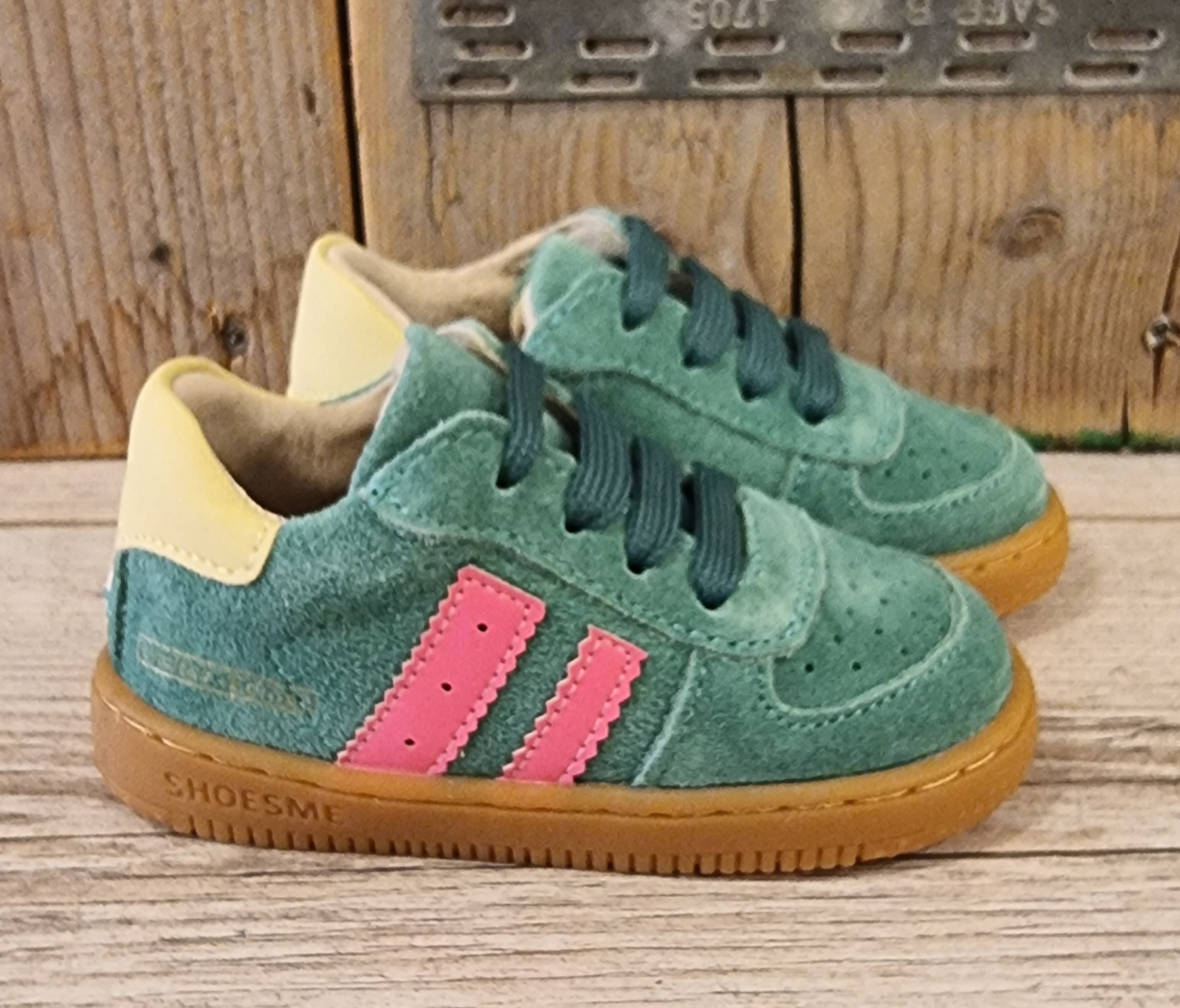 Eerste stapschoentjes van Shoesme in groen met roze details. Deze ontzettend schattige schoentjes hebben een soepele zool voor kindjes die nog niet zo lang helemaal los lopen. Deze schoentjes hebben een normale pasvorm, niet geschikt voor kindjes met hele smalle voetjes.